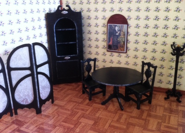So.. I decided with all those magazine 'bit's.. I'd make a corner room to take photo's in. The magazines provided parts to make a dolls house too.. but I didn't get all parts so thought the pieces would be handy used for other things. I slapped this together, also using the wallpaper and flooring provided in the kits... and the furniture shown is also from that collection. The picture on the wall I just put there for character LOL